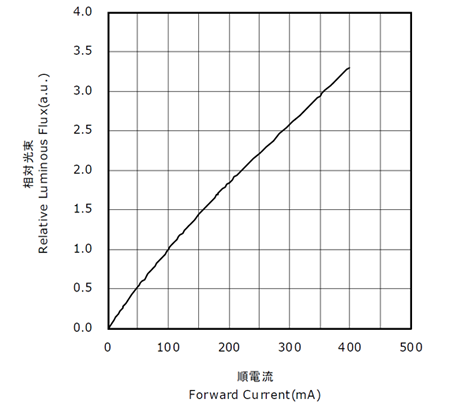 Next, the second step is to calculate the luminous multiplier based on the LED's operating current. For example, if the LED is being driven at 150 mA. First, refer to the "Current vs. Luminous Flux" curve chart in the datasheet, as shown below: