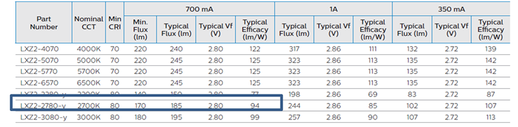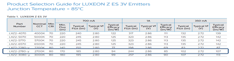 First, obtain the relevant specification values from the LED's datasheet, as shown below. Since the used LED with a color temperature of 2700K. We extracted the values for 2700K shown in figure 5. Please note that Luxeon Z ES's specification values are measured at Tj=85°C, which is different from the 25°C reference of Nichia used previously.