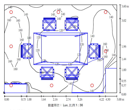 Figure 3 demonstrates the analysis result of light distribution of a luminaire after importing an IES-format file into Dialux. This light intensity distribution is equivalent to the illumination of the luminaire light source considered as a dummy point source without geometrical size in the software. In Dialux, designers can freely arrange these light sources - similar to arranging luminaires - according to their needs. For example, one uses Dialux to design the luminaire layout for a meeting room. The final illumination distribution is shown in figure 4.