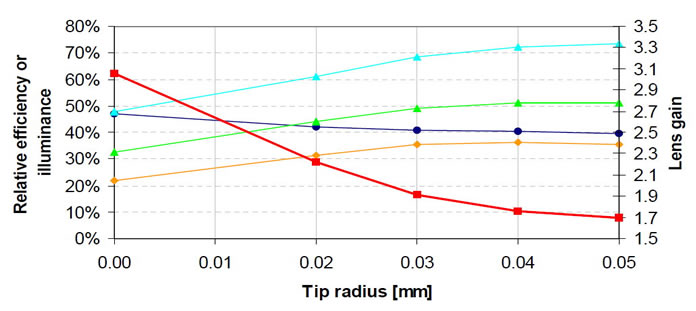 圖五是Tip半徑值的變化,對閃光燈透鏡的相關光學表性的影響的曲線圖;橫坐標是tip的半徑值,圖上的紅色線是代表增益值的變化,對應的縱軸是圖右的軸;橘色線是角落均勻度值的變化,對應的縱