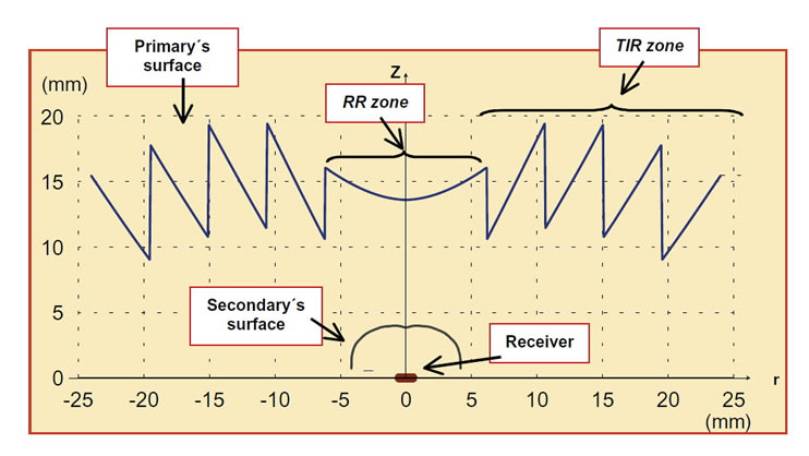 閃光燈透鏡,業界通稱Flash Lens,學界稱為TIR-R Lens;該透鏡常見應用於手持式裝置,例如手機或平板之類的裝置,功能是透過薄形光學件,做到能增加指定範圍的照度值,同時又兼顧到均勻度的一種透鏡設計;業界常把TIR-R Lens和Fresnel Lens搞混,兩者都是把凸透鏡薄化的方式,Fresnel Lens是TIR-R的一項特例,兩者的確有共同的原理,但卻略有不同之處;TIR分成全反射區以及折射區,在折射區內的齒型通常為曲面設計,與Fresnel lens是斜邊設計略有不同。如下圖所示,就引用Jose等學者[1]的期文論文中的圖面說明,就能很清楚理解,TIR-R的光學架構理念。