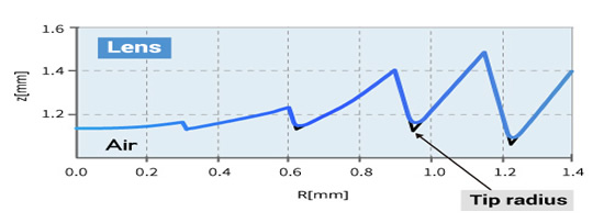 確保TIP值的大小,是設計和加工和成形都必須一併考量的;加工來說,當前業界大多流行金鋼石超精車床用作加工齒形,齒形的TIP值大小,取決於加工刀具的R值大小;接著是成形的縮水,成形必然有縮水,如何取得保壓和成形時間成本之間做優化考量,考驗模具和成形形的技術能力。光學設計人員要先掌握好加工、模具和成形的能力的情況下,再去設計考慮工藝極限下的光學成品,此時才能得到良好的平衝設計光學效果。