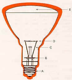 PAR為拋物線反射罩(parabolic aluminized reflector)的縮寫字,意思是雙曲線形式的鍍鋁反射杯,如下圖所示,在杯身的處鍍鋁,讓光可以有效反射向E處打出;PAR後面接的數字是代表開口直徑值,規定每8的倍數為1英吋;舉PAR 20為例,除以8,就是2.5,開口直徑值就是2.5英吋,單位轉成公制是2.5×2.54cm =6.35cm,PAR20的開口直徑約為長6.35公分(常標注為65mm)。