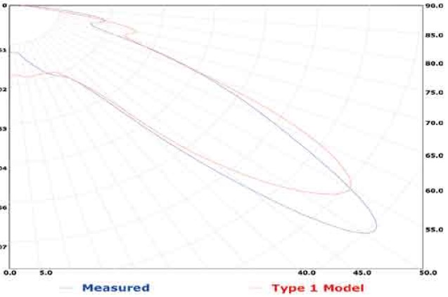 引用LED Professional[2]的2008年11/12月的期刊中的"LED Source Modeling Method Evaluations",作者是Mark Jongewaard和Kurt Wilcox[3]。Type 1編號,指的是取用Radiant Image的光源檔,LED幾何外形只是參考用,無光學屬性;Type 3編號,是指利用Photopia[4]建立的精確封裝光源模擬零件檔,包括LED光源的封裝膠的特性,以及LED支架的反射特性,並以模 型的方式建立發光晶片;把Type 1的光源匯入到一個標準的路燈設計檔案,並分析得到的結果如圖四的紅色線,而圖四的黑色線是實際成品所量測到的光強結果;兩條曲線比較,在低角度處的吻合度高,但在高 角度處,仿真和實測值,是有明顯的差異,尤其是最大角度位置,此值會影響到路燈規範是否滿足。